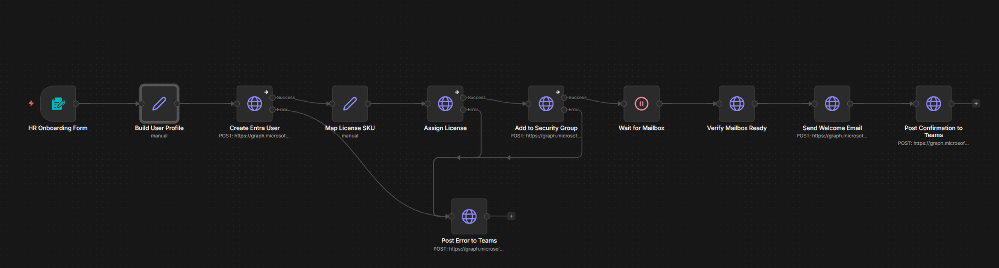 The old process, written out honestly: get a message, create the Entra ID account, go find which license template applied to this role, assign it, remember which security groups to add, create the OneDrive/mailbox (which sometimes required waiting), draft a welcome email, post in the IT channel that it was done. Then find out two days later that the license had failed silently and the new hire had been logging in with degraded access since day one.